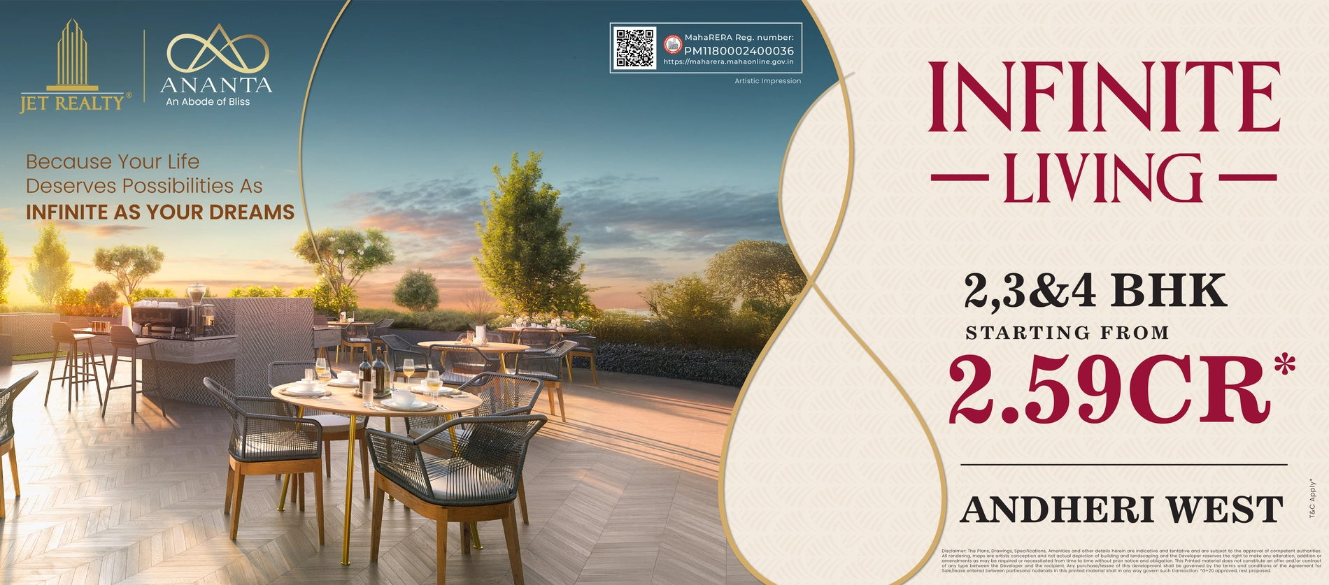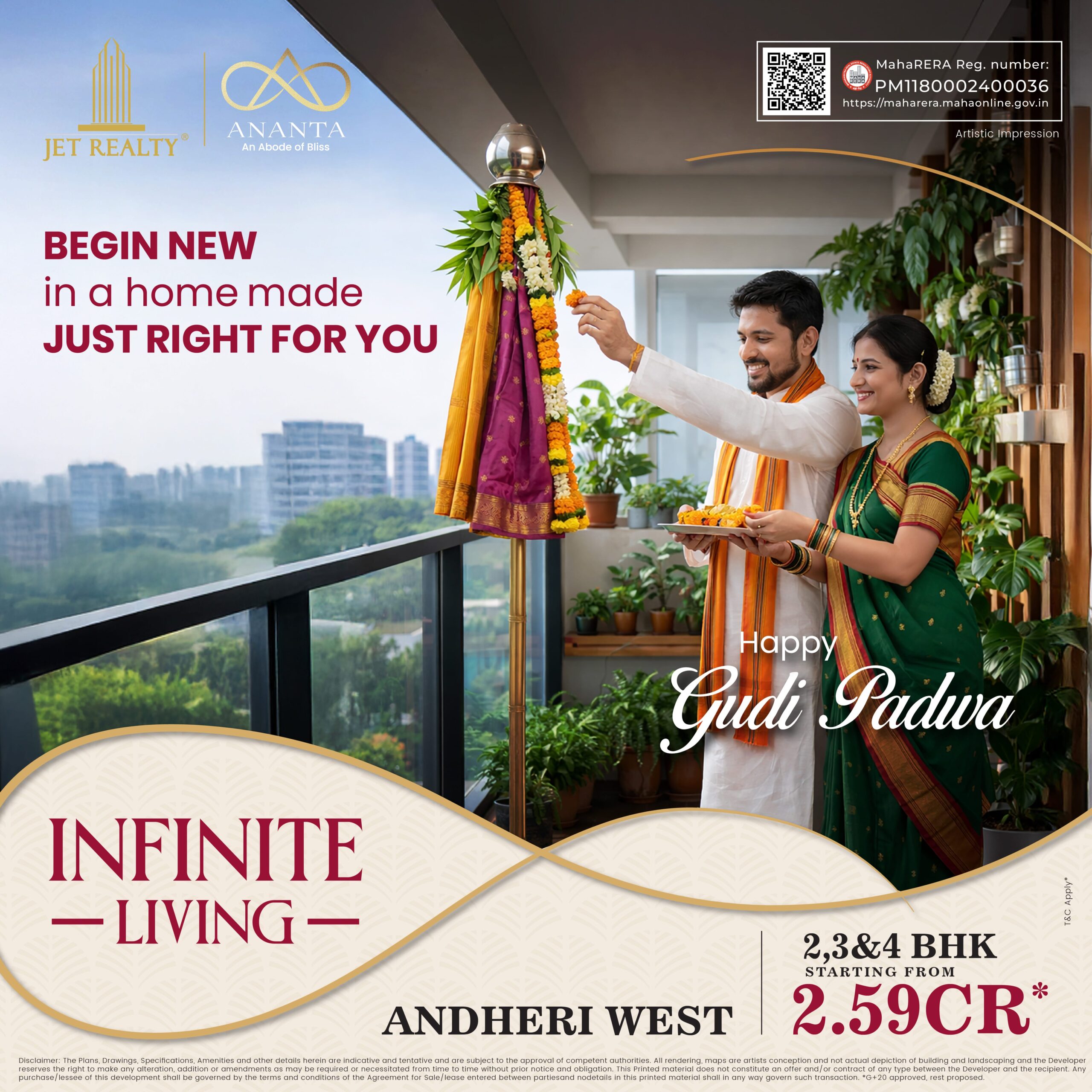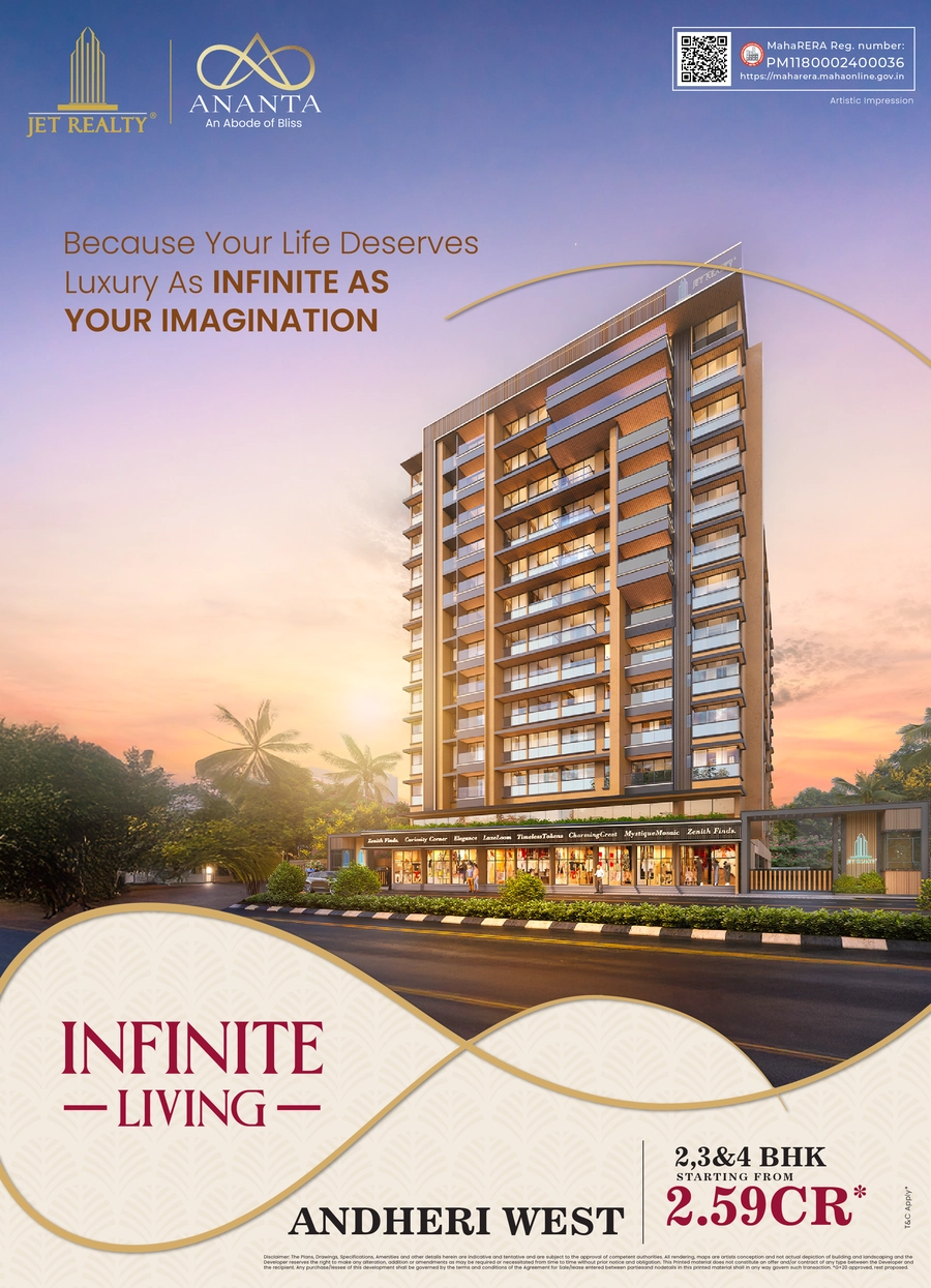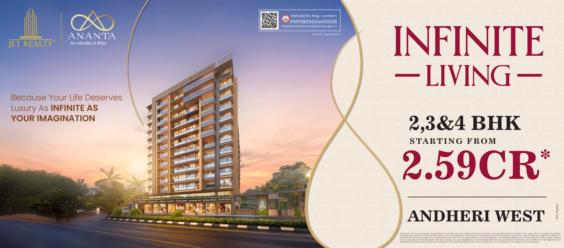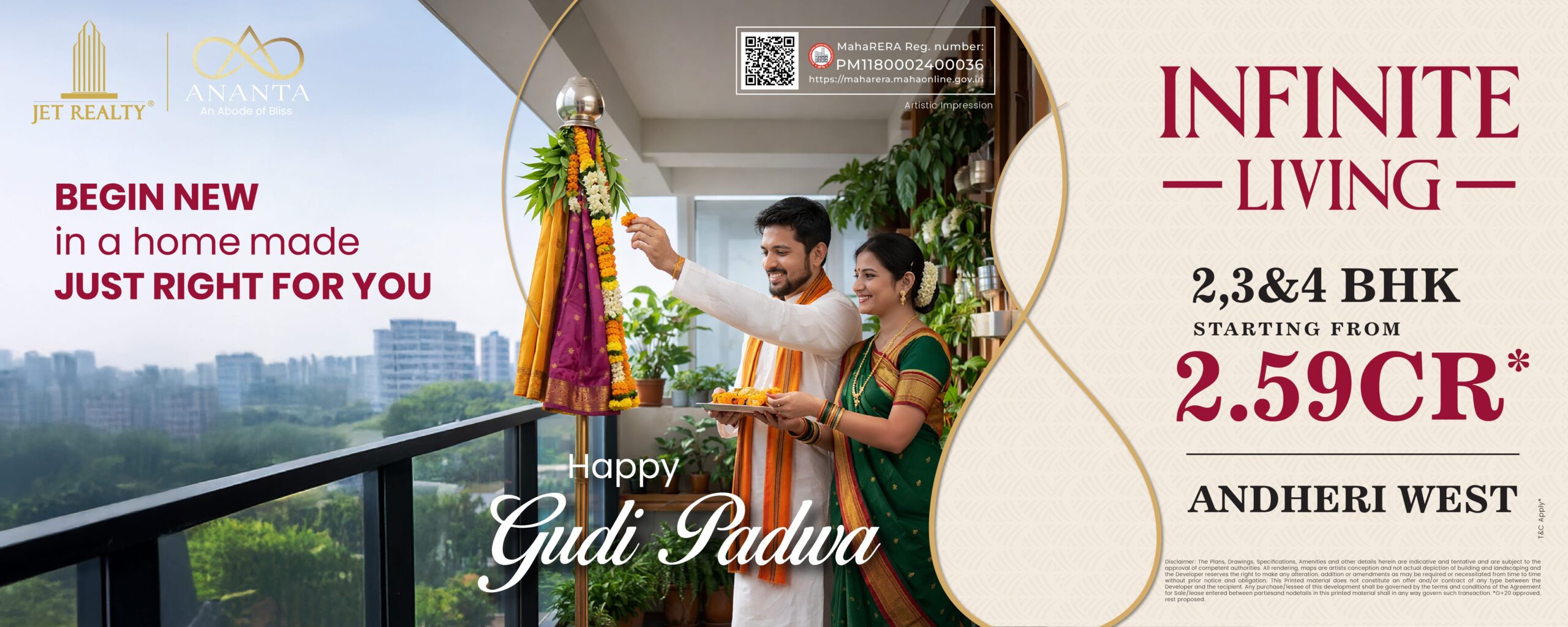 Rising gracefully as an iconic 12-storey tower, Ananta by JET Realty is crafted for those who seek space, harmony, and a refined lifestyle. Offering spacious 2, 3, and 4 BHK residences — among the largest layouts in the neighborhood, every home is thoughtfully planned with a Vastu-compliant design philosophy to invite balance and positivity. Set in a prime location and enriched with landscaped zones across multiple levels, Ananta brings together modern architecture and mindful living to create a landmark address.